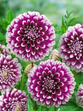 De volledig gevulde, decoratieve bloemen hebben dieppaarse of wijnrode bloembladen met delicate witte uiteinden, wat een opvallend tweekleurig effect creëert.